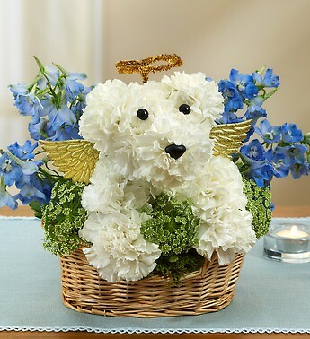 Send your deepest sympathies for the loss of a loved one or beloved pet with our truly original a-DOG-able® arrangement. Hand-arranged in a charming dog bed basket in the shape of an angelic dog, complete with golden wings and halo, fresh carnations, delphinium and Queen Anne's lace offer a lasting memorial for friends and family who were dog lovers, or to honor the passing of a canine family member.